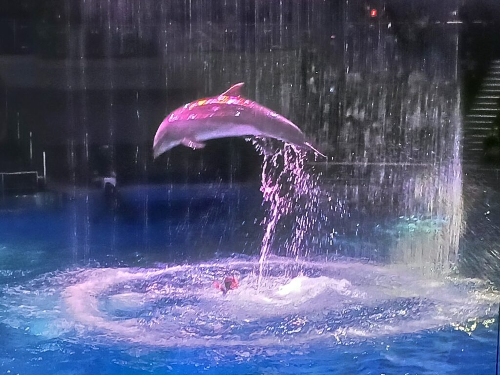 紅葉をイメージしたプロジェクショマッピングの中での幻想的なイルカショーで感動し、様々なテーマのもとに展示されためずらしい海水・淡水の生物を観察しました。